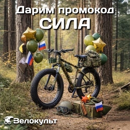 В честь Дня защитника Отечества мы дарим вам промокод на приобретение билета на «Велокульт 2026». На котором вы сможете купить всё, что нужно настоящему вело-бойцу: запчасти, экипировку, аксессуары и даже новый велосипед!